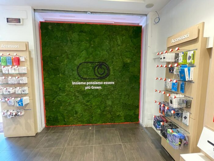 L’agenzia Beready ha pensato di allestire le vetrine dei Vodafone Store con materiali 100% green per sottolineare come l’attenzione di Vodafone al tema della sostenibilità. Da qui l’idea di realizzare nelle vetrine degli store nelle principali città italiane una struttura full frame con vero muschio stabilizzato.