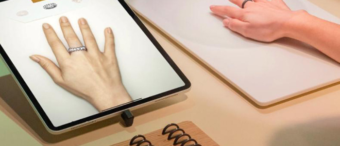 I clienti indossano un anello nero al dito, che funge da dispositivo di cattura del movimento. Il software posiziona quindi un anello della collezione sull’anello nero e mostra al cliente il risultato sull’iPad. Il dispositivo AR utilizza una rete neurale guidata dall’intelligenza artificiale che è stata addestrata per eseguire il rendering realistico di un anello in tempo reale.